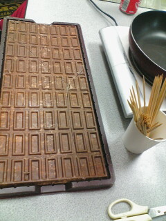 先輩が2000円で買ってきた巨大板チョコ(700g)を叩き割って、牛乳と生クリームと共にフライパンで暖めてドロドロにした後
